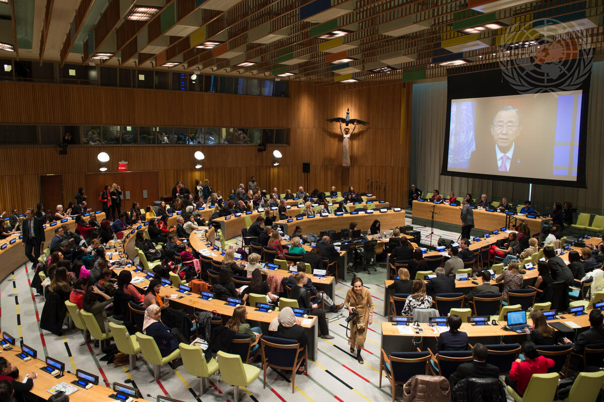 A wide view of a special event on the theme, “Planet 50-50 by 2030: Step It Up for Gender Equality”, as Secretary-General Ban Ki-moon (shown on screen) addresses participants via video message. The event was organized by the United Nations Entity for Gender Equality and the Empowerment of Women (UN Women) on the occasion of International Women’s Day (8 March).