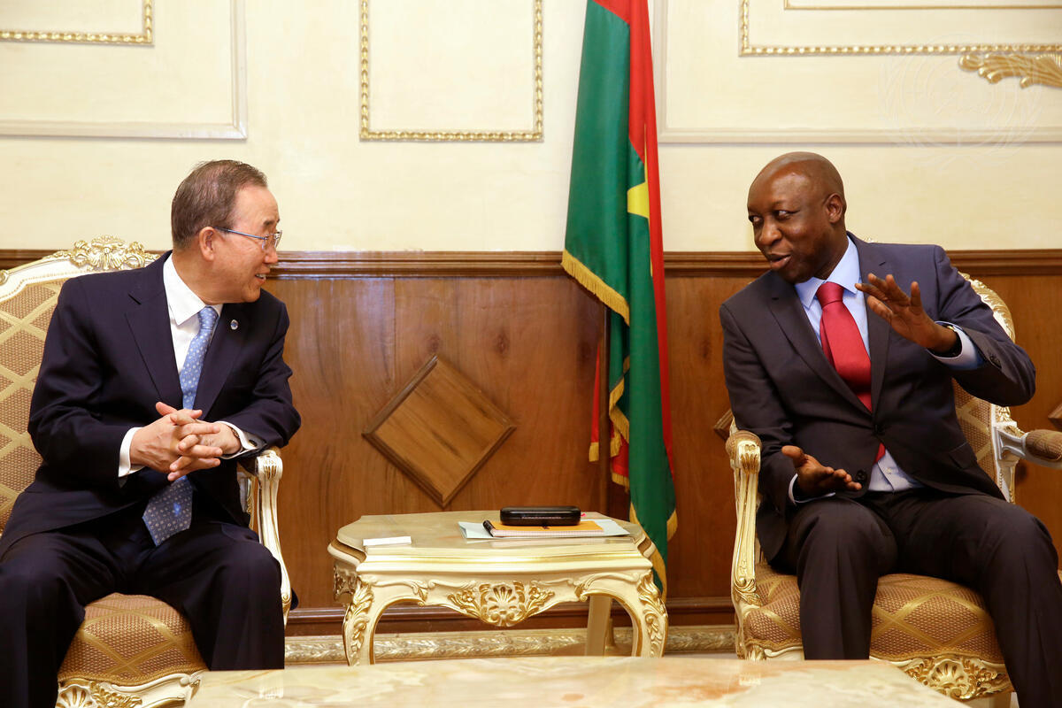 Secretary-General Ban Ki-moon (left) meets with Paul Kaba Thieba, Prime Minister of Burkina Faso, in Ouagadougou.