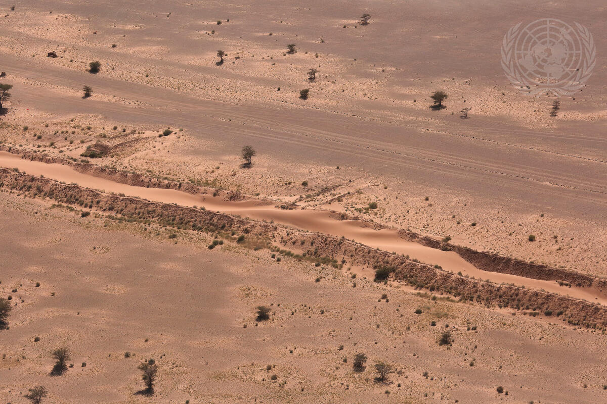 An aerial view of the sand wall that runs through southeastern Morocco and the Western Sahara taken en route from the Polisario Front's Rabouni camp near Tindouf, Algeria to the Bir Lahlou site of the United Nations Mission for the Referendum in Western Sahara (MINURSO).