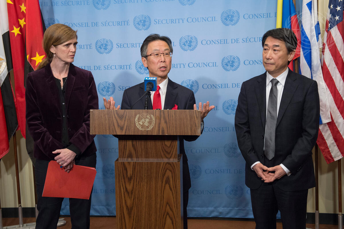 Motohide Yoshikawa (centre), Permanent Representative of Japan to the UN, speaks to journalists following the adoption of the resolution. Also addressing the press with him were Samantha Power (left), United States Permanent Representative; and Oh Joon, Permanent Representative of the Republic of Korea.