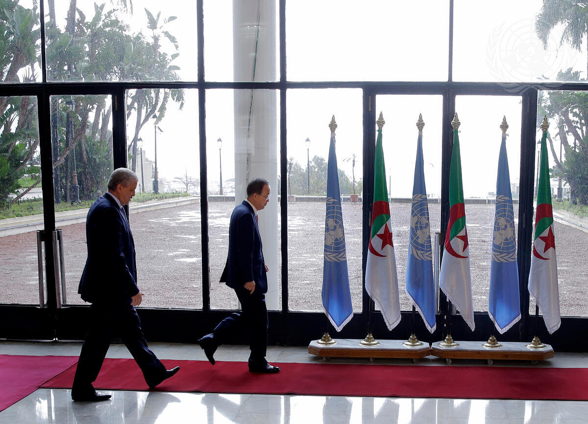 Secretary-General Ban Ki-moon (right) and Abdelmalek Sellal, Prime Minister of Algeria, en route to their meeting at the Government Palace in Algiers.