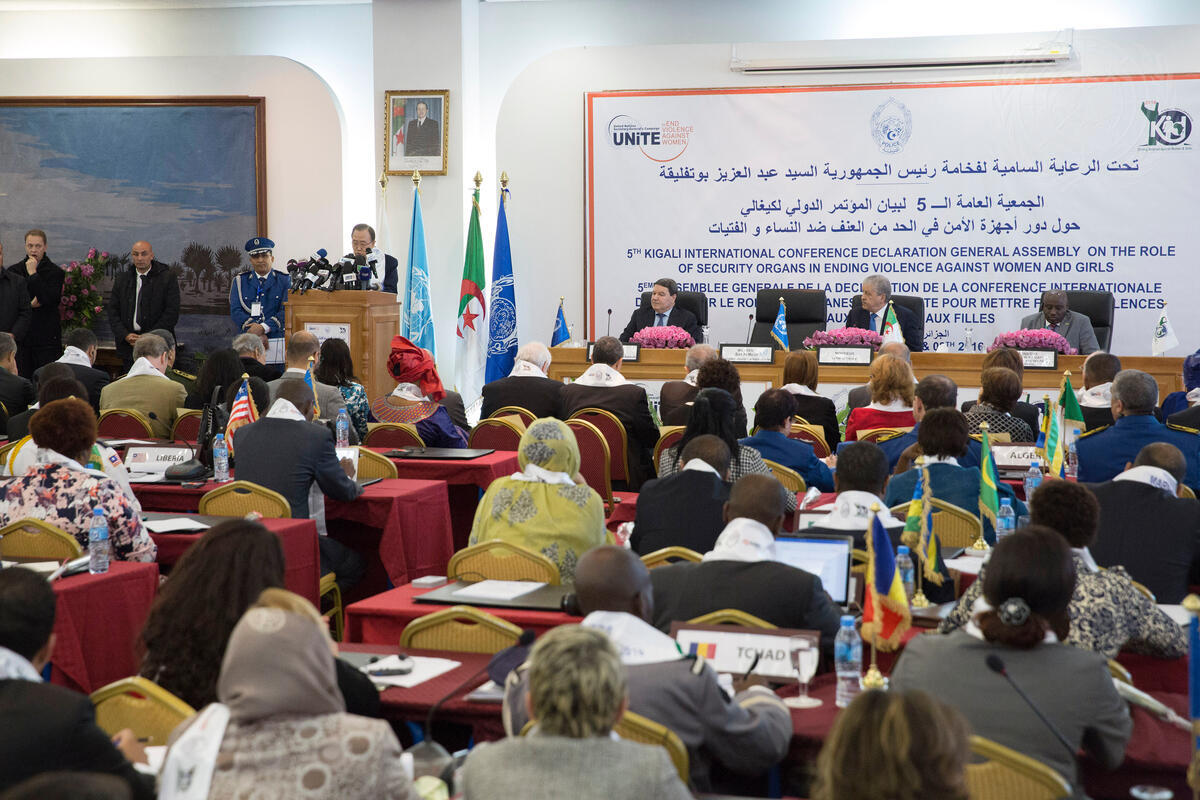 Secretary-General Ban Ki-moon (at lectern) addresses the fifth General Assembly of the 2010 Kigali International Conference Declaration on the “Role of Security Forces in addressing Violence against Women and Girls”.