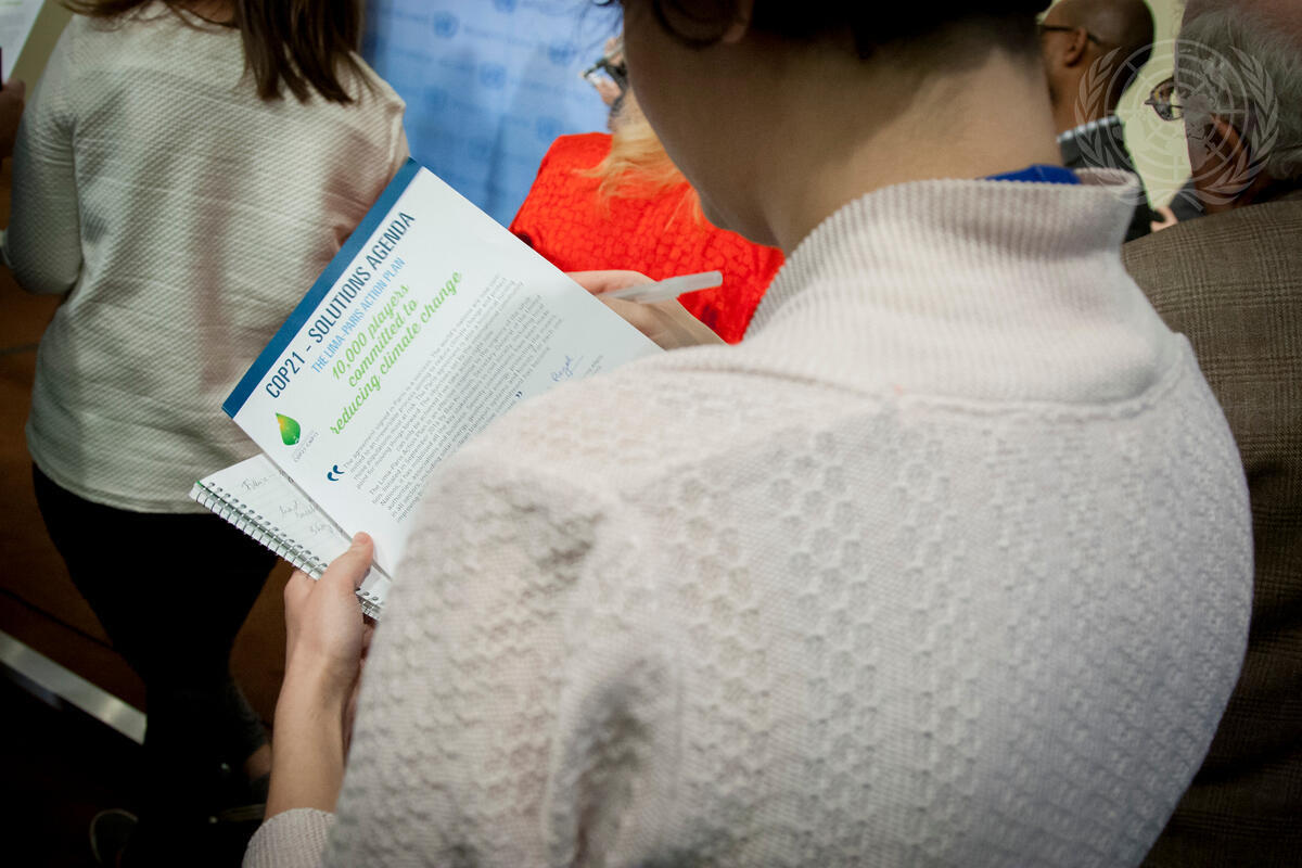 A reporter peruses information material from the 2015 UN Climate Change Conference held Paris, France (COP21).