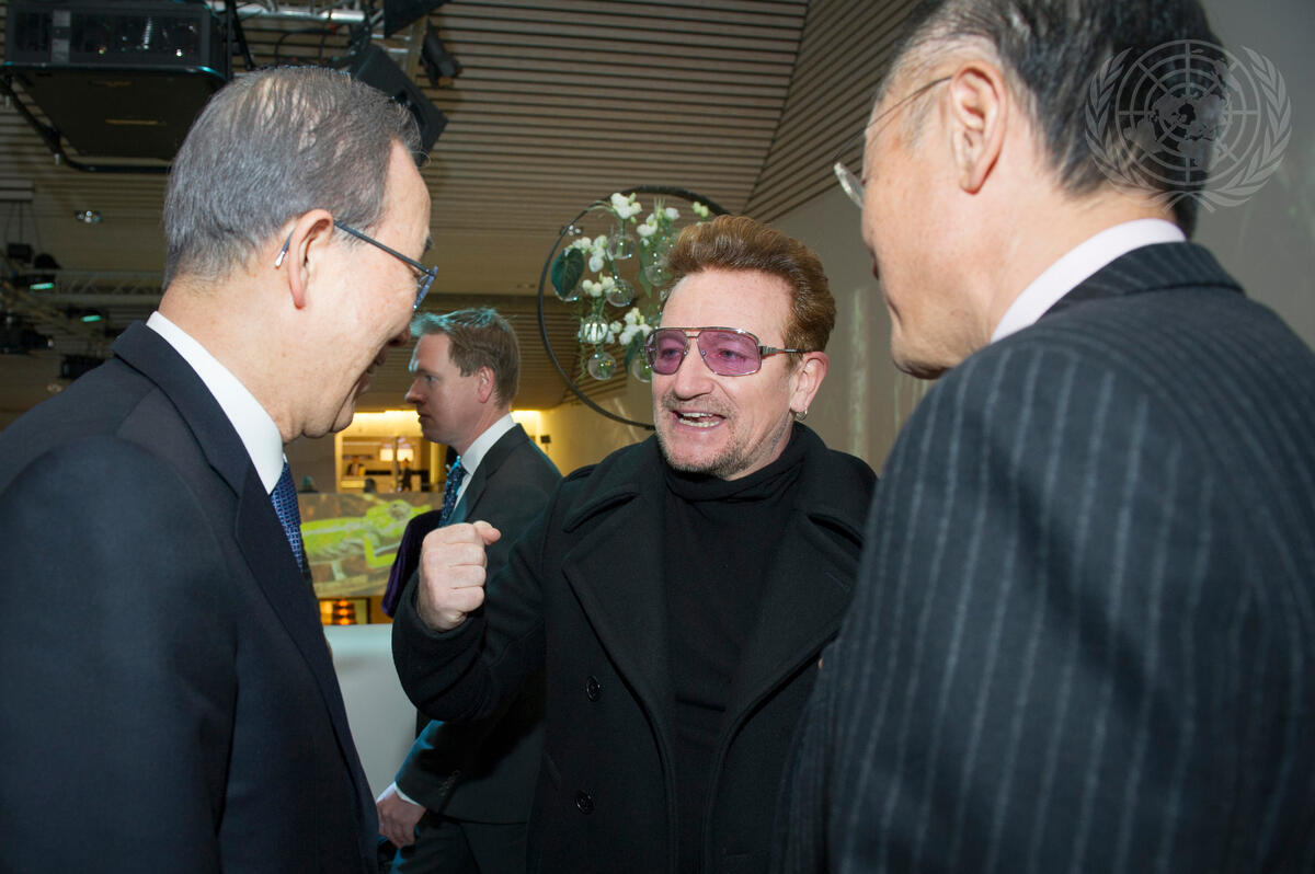 Secretary-General Ban Ki-moon with Bono and Jim Yong Kim, President of the World Bank, during the World Economic Forum in Davos, Switzerland.
