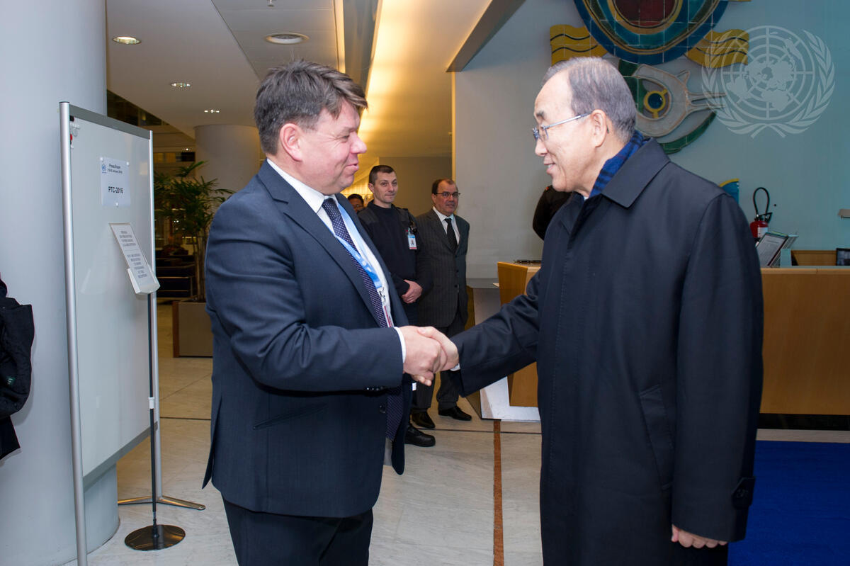 Secretary-General Ban Ki-moon (right) meets with Petteri Talaas, Secretary-General of the World Meteorological Organization (WMO), at the WMO Headquarters in Geneva, Switzerland.