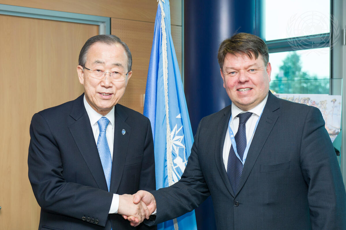 Secretary-General Ban Ki-moon (left) meets with Mr. Petteri Talaas, Secretary-General of the World Meteorological Organization (WMO), at the WMO Headquarters in Geneva, Switzerland.