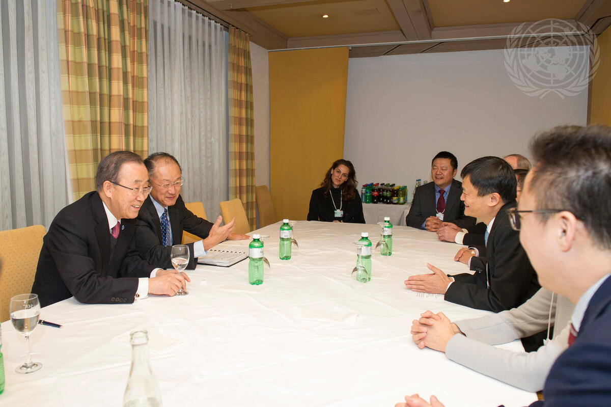 Secretary-General Ban Ki-moon (left) meets with Jim Yong Kim (second from left), President of the World Bank. and Jack Ma, founder and Executive Chairman of the Chinese company Alibaba Group Holding Ltd.