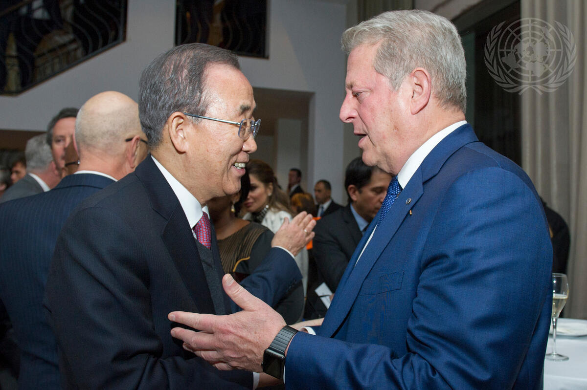 Secretary-General Ban Ki-moon chats with Al Gore at a dinner event hosted by Klaus Schwab, Founder and Executive Chairman of the World Economic Forum, in Davos, Switzerland.