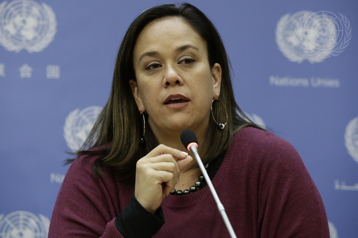 Amy Kalili from Hawai'i, USA speaks at a press conference on the preservation and revitalization of indigenous languages.