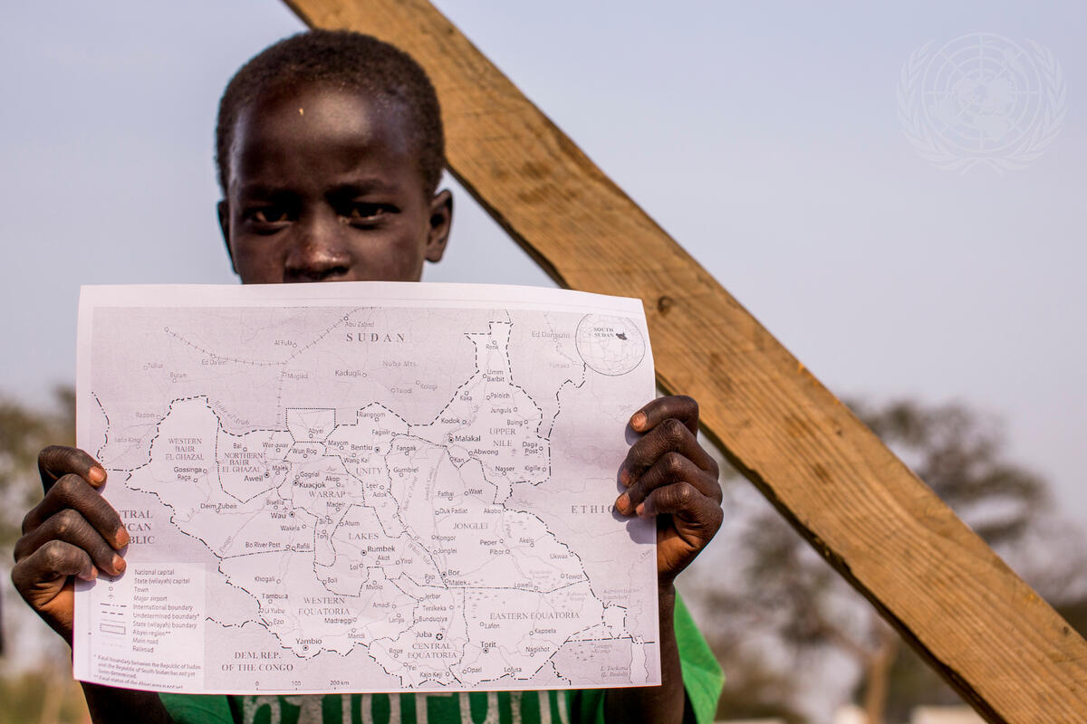 A child holds up a map of South Sudan, in a medical care centre for children in Bor, South Sudan.