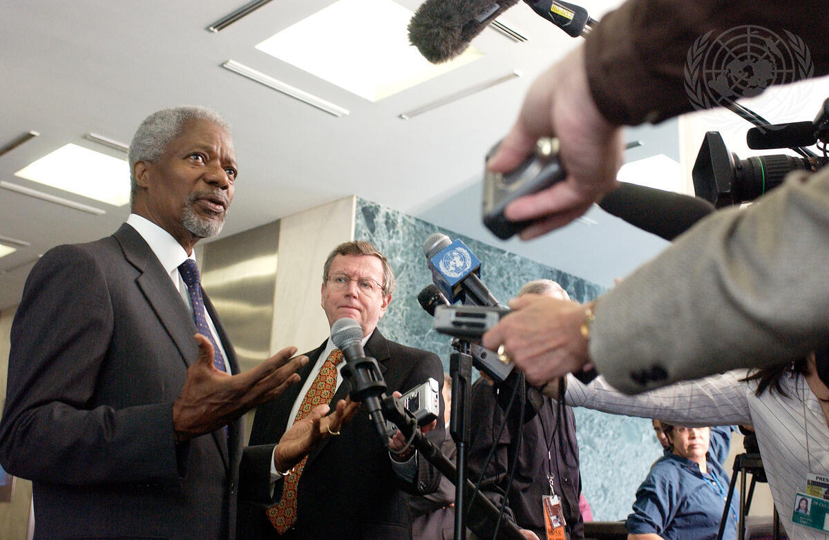 Secretary-General Kofi Annan (left) address the press on his arrival at the United Nations headquarters today. In the centre is Fred Eckhard, Spokesman for the Secretary-General.