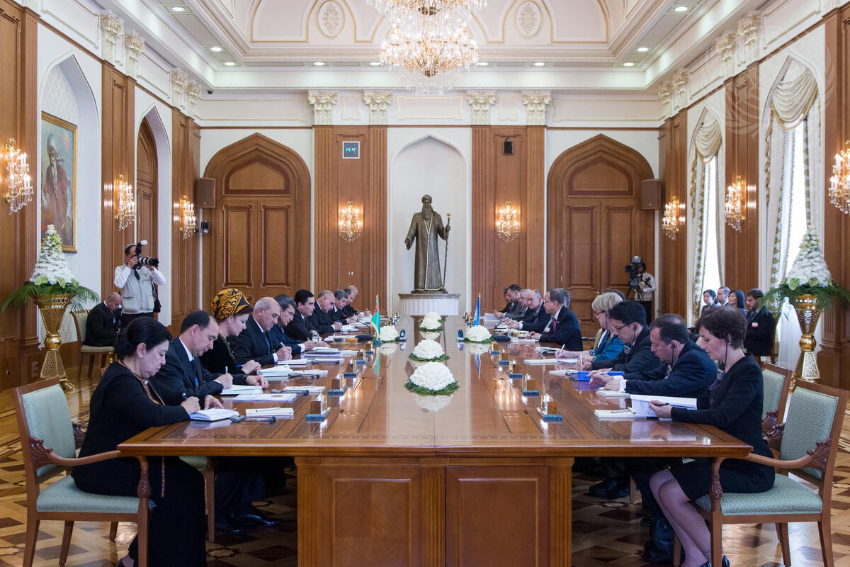 A wide view of the meeting of Secretary-General Ban Ki-moon and Gurbanguly Berdimuhamedov, President of Turkmenistan, and cabinet members of Turkmenistan.