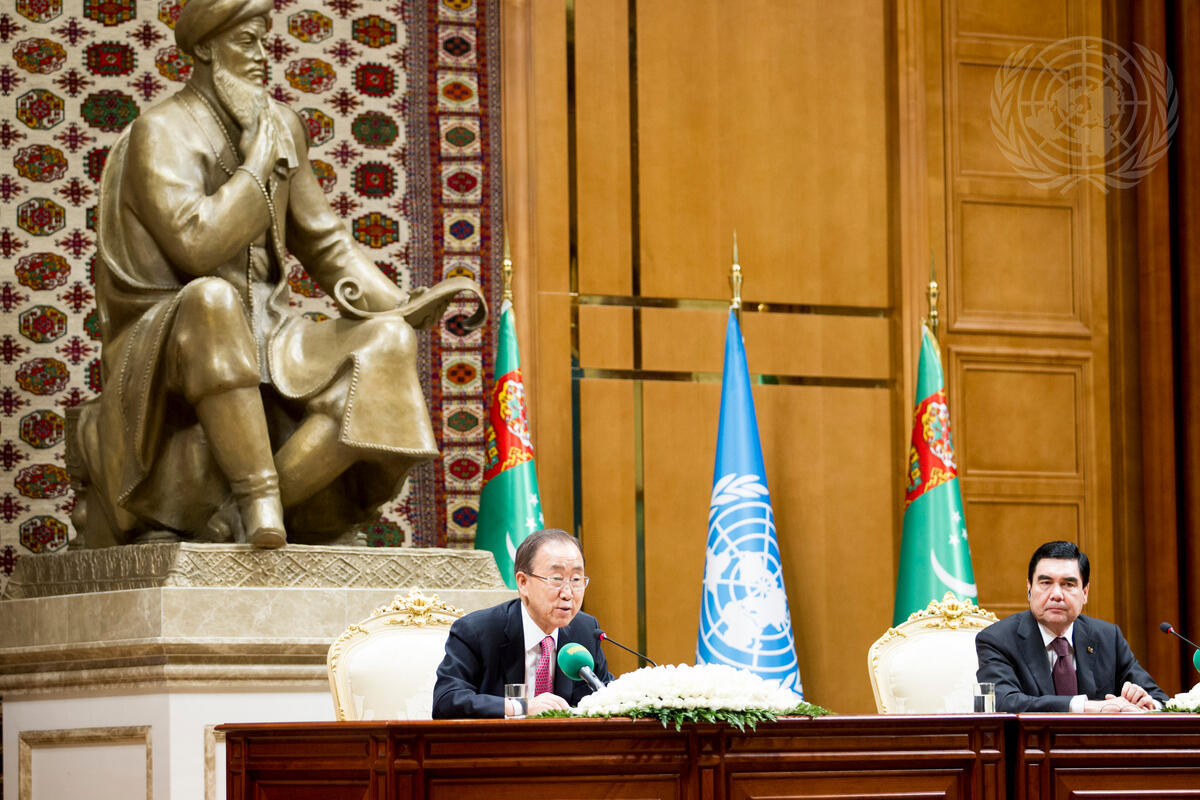 Secretary-General Ban Ki-moon (left) jointly addresses a press conference with Gurbanguly Berdimuhamedov, President of Turkmenistan, in Ashgabat.
