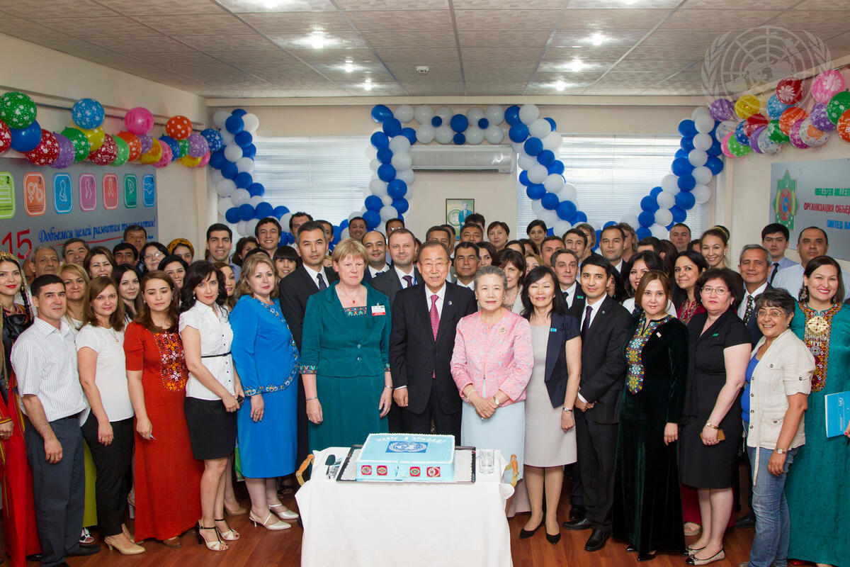 Secretary-General Ban Ki-moon (front centre) and his wife, Yoo Soon-taek (front centre right), pose for a group photo with UN staff serving in Turkmenistan. Mr. Ban marked his 71st birthday during his visit with the staff.