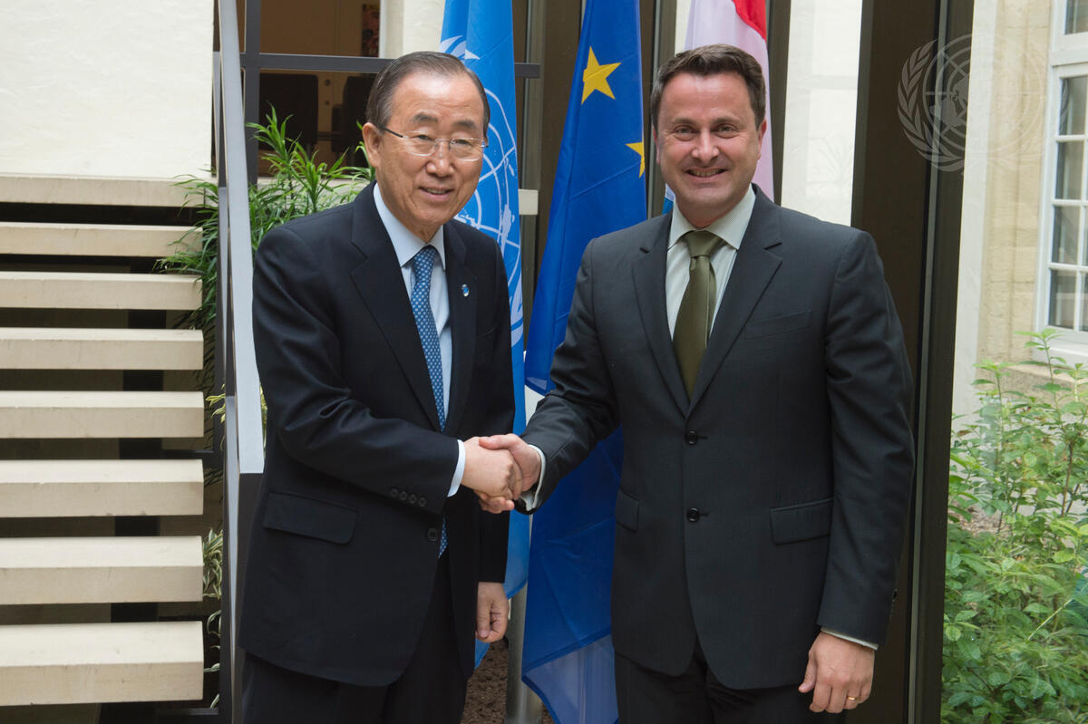 Secretary-General Ban Ki-moon (left) meets with Xavier Bettel, Prime Minister of Luxembourg.
