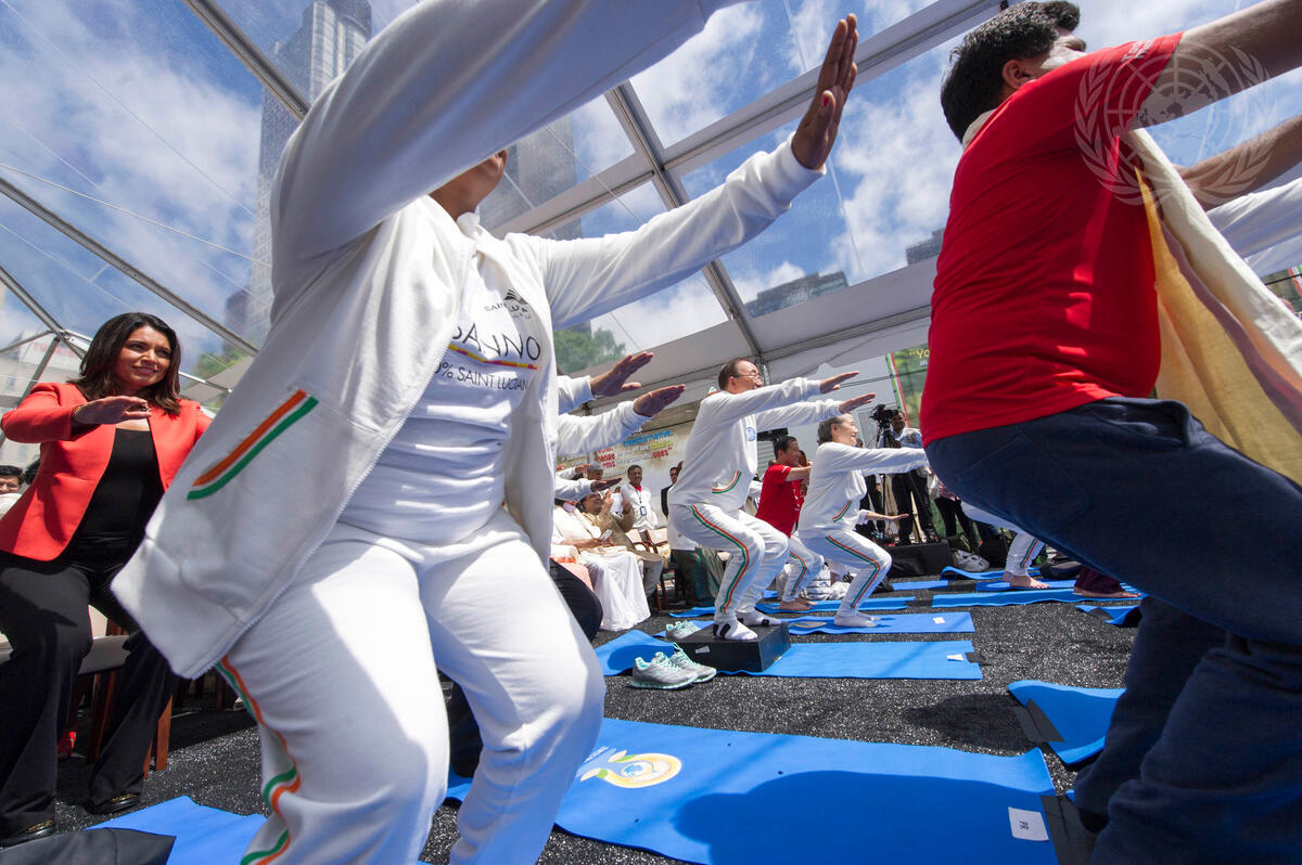 Participants practice yoga during a special event celebrating the first International Day of Yoga at UN Headquarters.