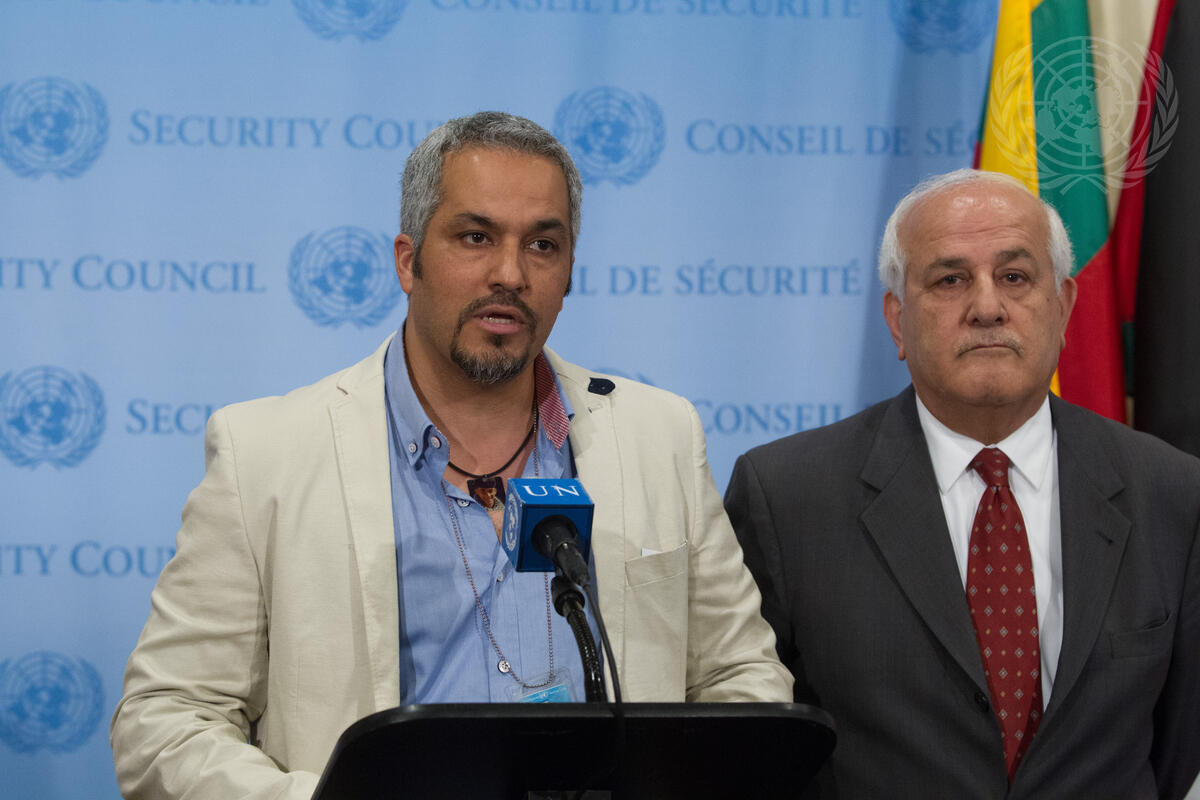 Caption Description Abu Nadeem (left), father of a Palestinian boy allegedly killed by an Israeli soldier in May 2014 during a peaceful protest in Betunia, in the West Bank, speaks to journalists in the context of the Security Council open debate on children and armed conflict. At his side is Riyad H. Mansour, Permanent Observer of the State of Palestine to the UN.