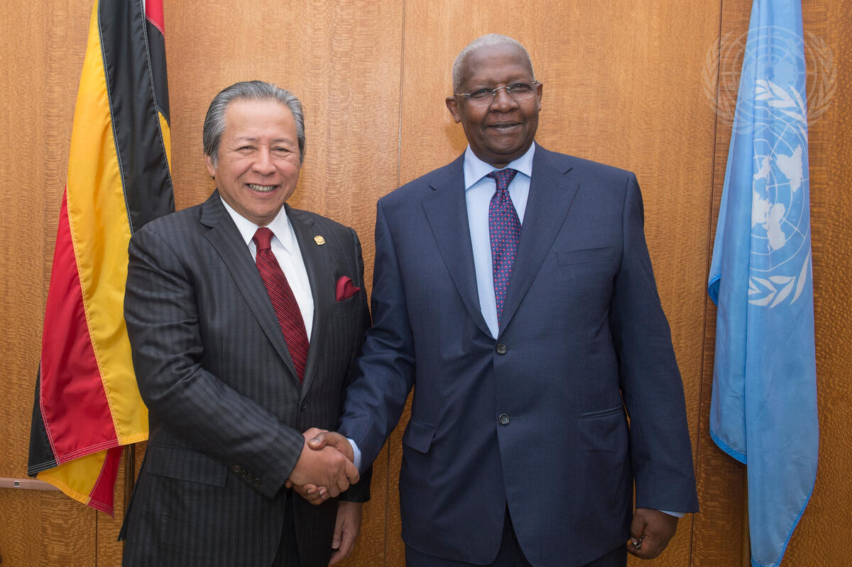 Sam Kutesa (right), President of the sixty-ninth session of the General Assembly, meets with Dato Sri Anifah Aman, Minister for Foreign Affairs of Malaysia.