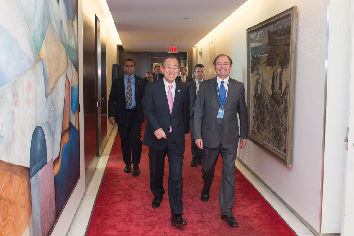 Secretary-General Ban Ki-moon (centre) meets with Pio Garcia-Escudero Marquez (right), President of the Senate of Spain.