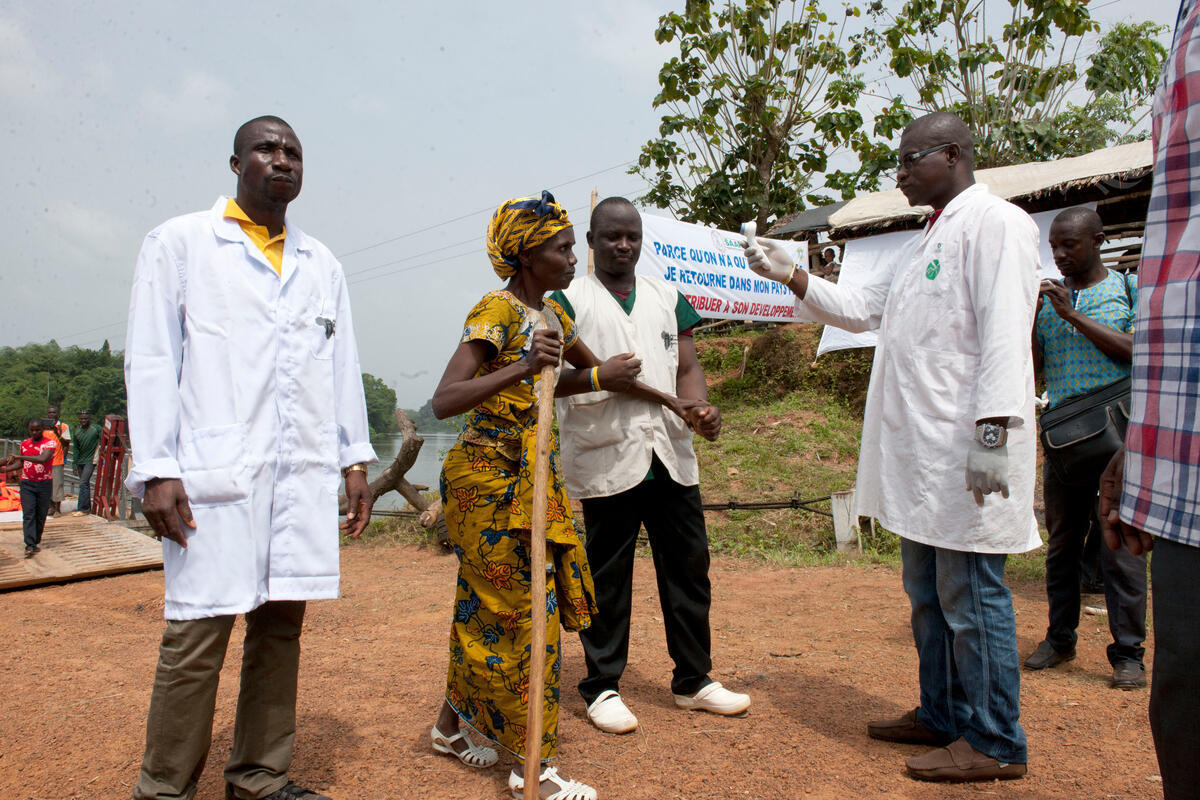 A returning Ivorienne gets her temperature checked on arrival at a transit centre in Tabou, south-western Côte d’Ivoire.