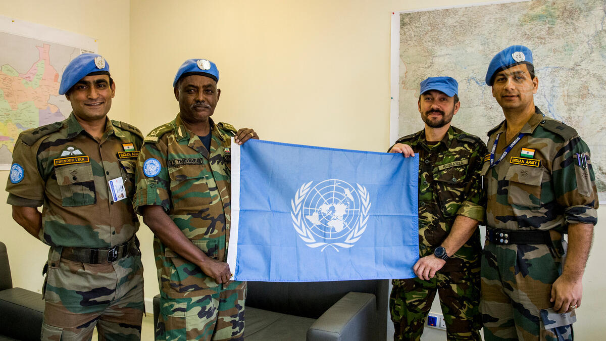 Three peacekeepers serving with the United Nations Mission in South Sudan (UNMISS) departed from Juba on 21 December bound for Mount Kilimanjaro in Tanzania. The peacekeepers plan to climb the mountain (the tallest in Africa) in the days leading up to Christmas and to plant the UN flag at the top as a symbol of peace for all countries and, specifically, peace for South Sudan. The climbers are Lieutenant Colonel Dipinder Virk (left), of the Indian Battalion; Major Liviu Chende (centre right), of the Romanian Contingent; and Major Vikash Kumar (right), of the Indian Battalion, pictured here in Juba with Lieutenant-General Yohannes Gebremeskel Tesfamariam, Force Commander of UNMISS, on 18 December.