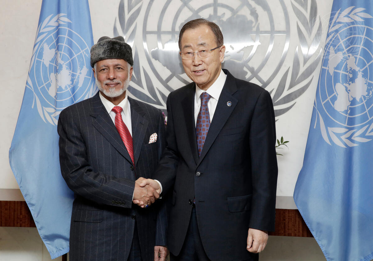 Secretary-General Ban Ki-moon (right) meets with Yousef Bin Al-Alawi Bin Abdulla, Minister of State for Foreign Affairs of the Sultanate of Oman.