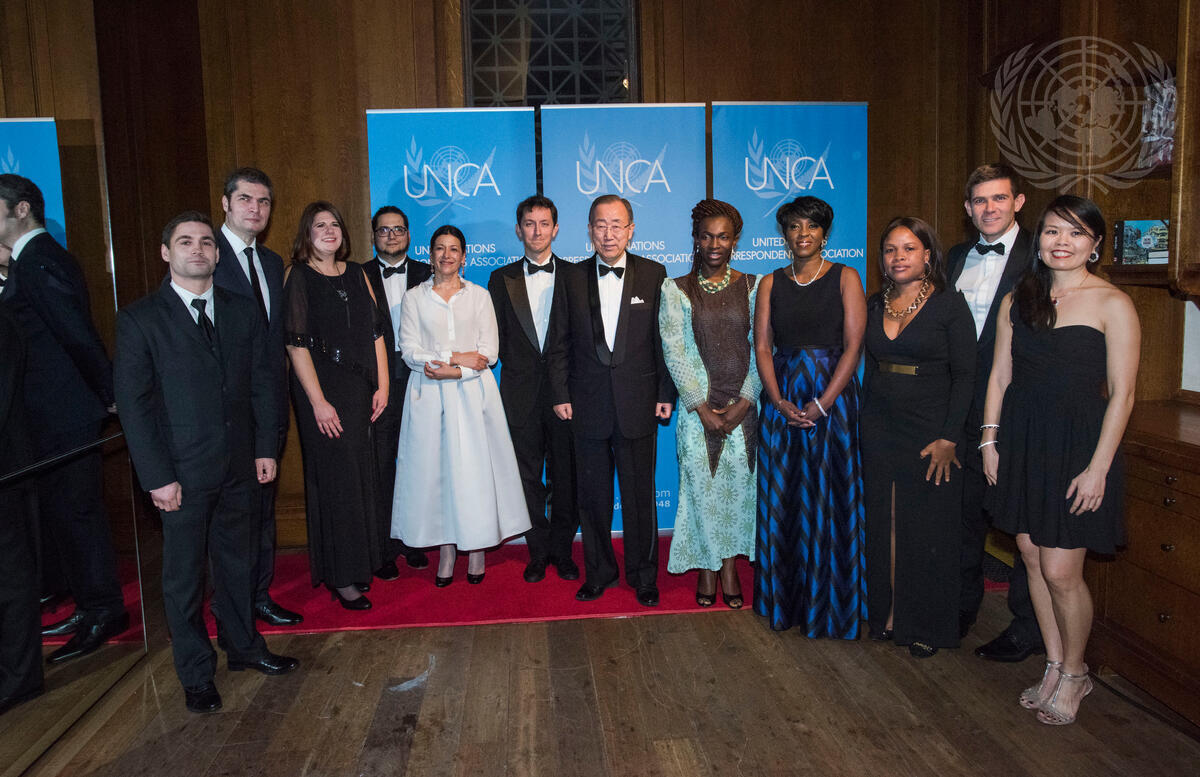 Secretary-General Ban Ki-moon (centre right) pose for a group photo with the 2015 UNCA Award winners at the Annual Awards Dinner and Dance of the UN Correspondents Association (UNCA).