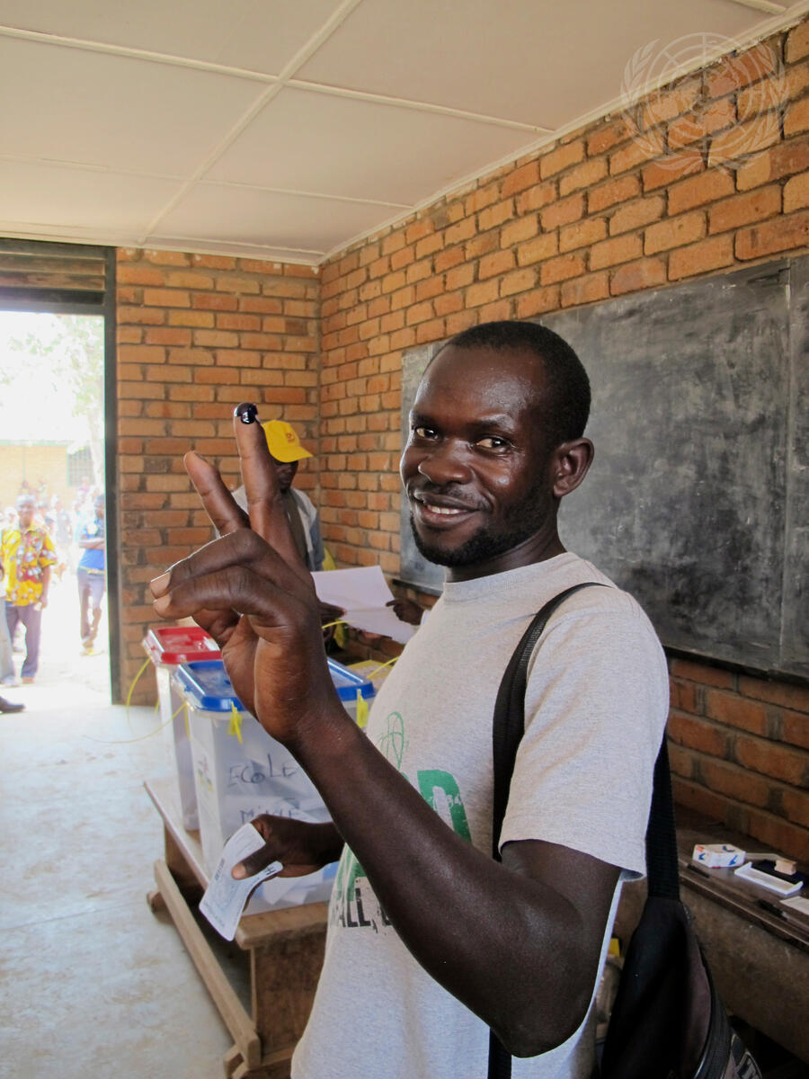 A voter shows his ink-dipped finger after casting his ballot at a polling station in Bangui