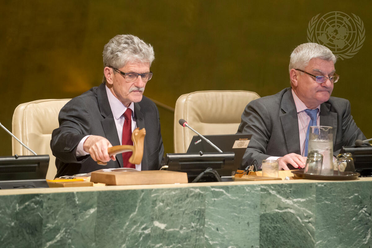 Mogens Lykketoft (left), President of the seventieth session of the General Assembly, chairs the meeting. At his side is Ion Botnaru, Director of the General Assembly and Economic and Social Council (ECOSOC) Affairs Division.