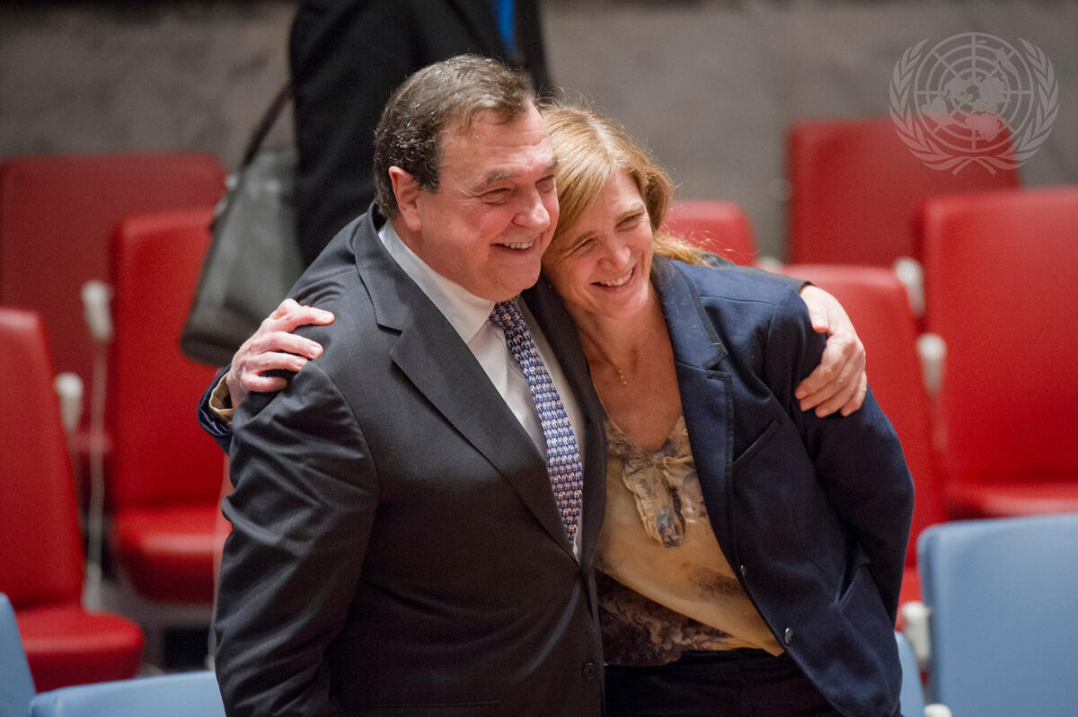 Samantha Power (right), United States Permanent Representative to the UN and President of the Security Council for December, with Christián Barros Melet, Permanent of Representative of Chile to the UN, in the Council Chamber.
