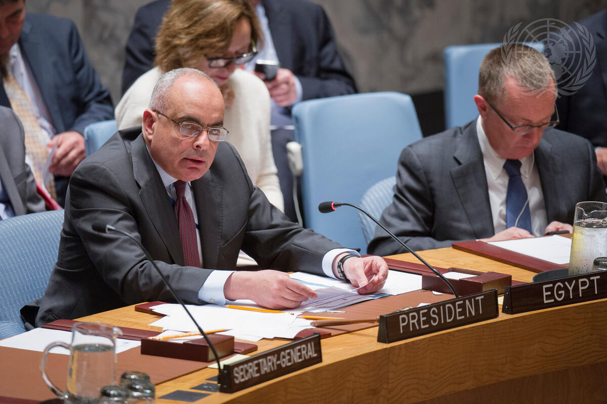 Amr Abdel Latif Aboulatta (front left), Permanent Representative of the Arab Republic of Egypt to the UN and President of the Security Council for May, chairs the Security Council meeting on the situation in Syria.