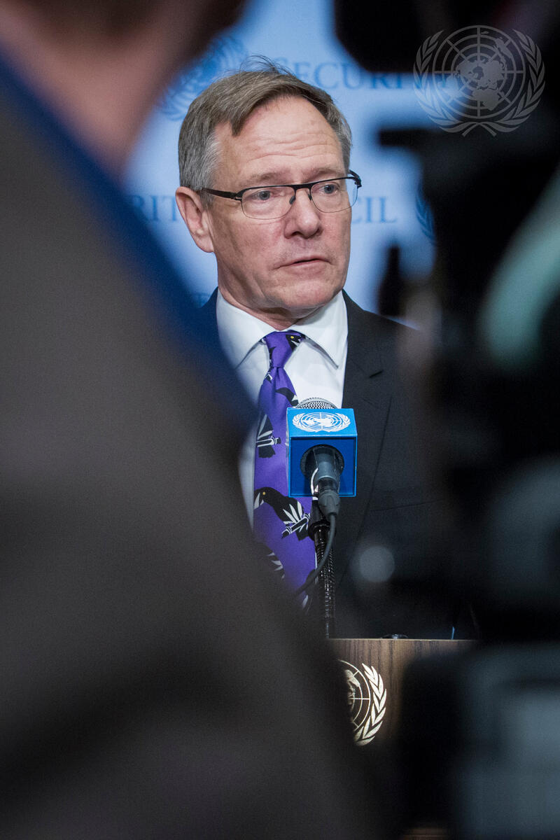 Gerard Jacobus van Bohemen, Permanent Representative of New Zealand to the UN, speaks to journalists following a Security Council meeting on the situation in Syria.