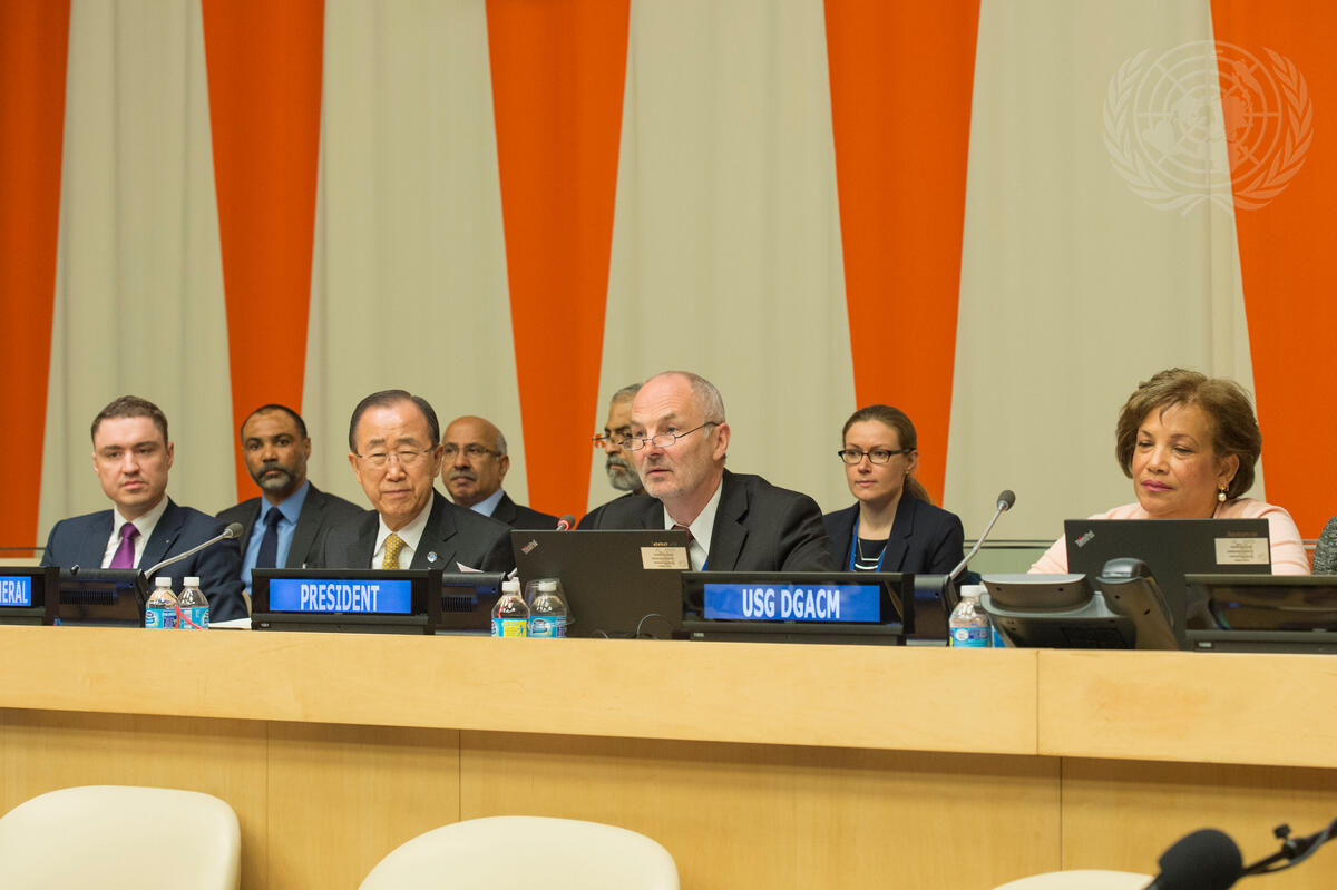 Sven Jürgenson (centre right), Permanent Representative of Republic of Estonia to the UN and Vice-President of ECOSOC, addresses the Integration Segment. Also pictured (from left on dais): Taavi Rõivas, Prime Minister of the Republic of Estonia; Secretary-General Ban Ki-moon; Catherine Pollard, Under Secretary-General for General Assembly and Conference Management.