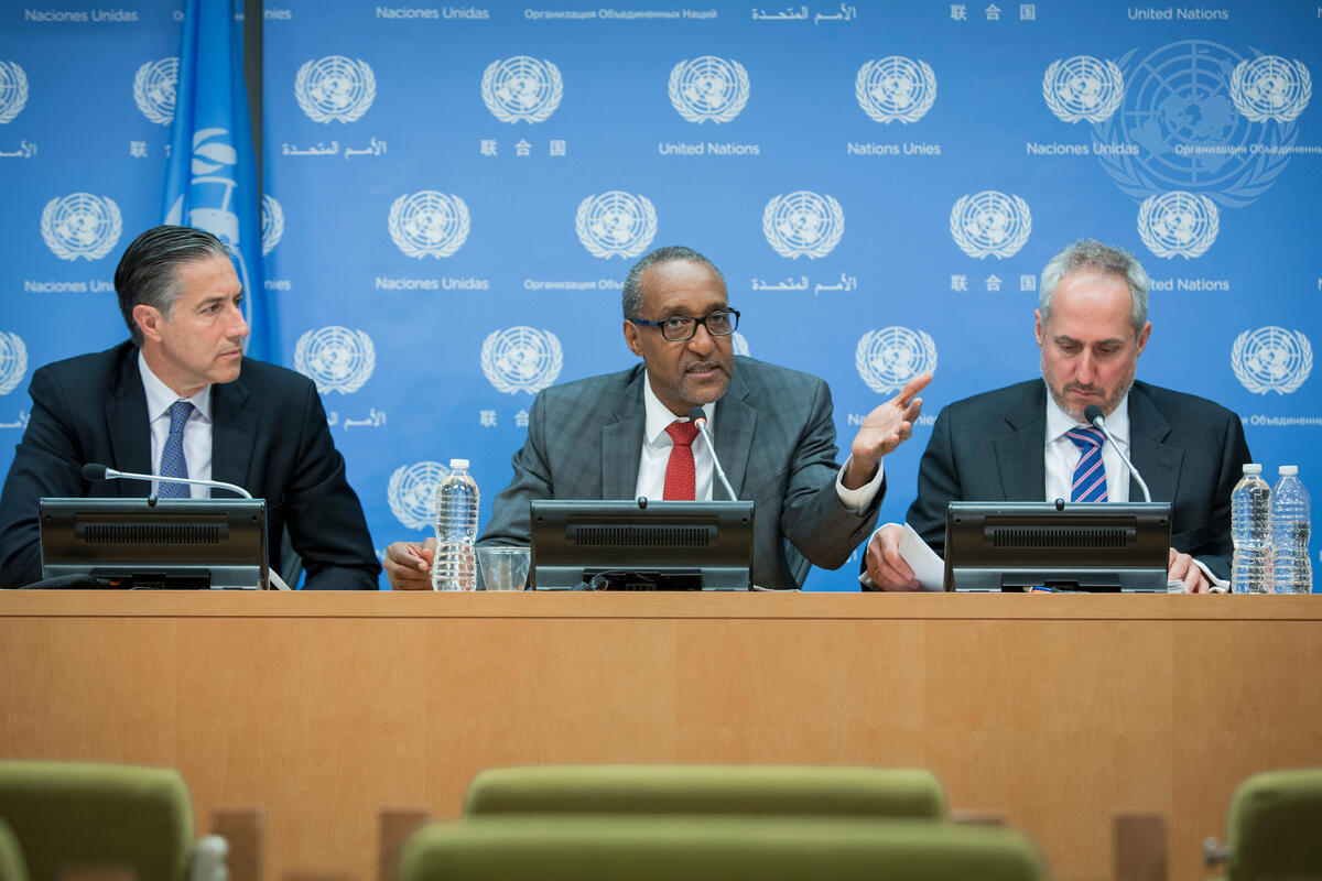 Macharia Kamau (centre), Permanent Representative of Kenya to the UN and Chair of the Peacebuilding Commission, briefs journalists on the substantively identical resolutions on peacebuilding adopted by the General Assembly and the Security Council. He is flanked by Oscar Fernández-Taranco (left), Assistant Secretary-General for Peacebuilding Support; and Stéphane Dujarric, Spokesperson for the Secretary-General.