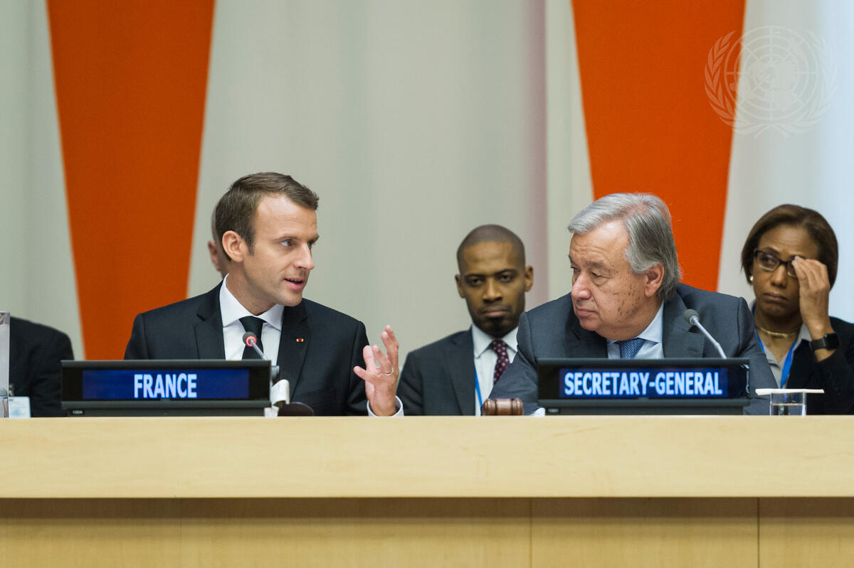 Caption Description Emmanuel Macron (left), President of France, makes remarks during a high-level event on ""Financing the Future: Education 2030"".