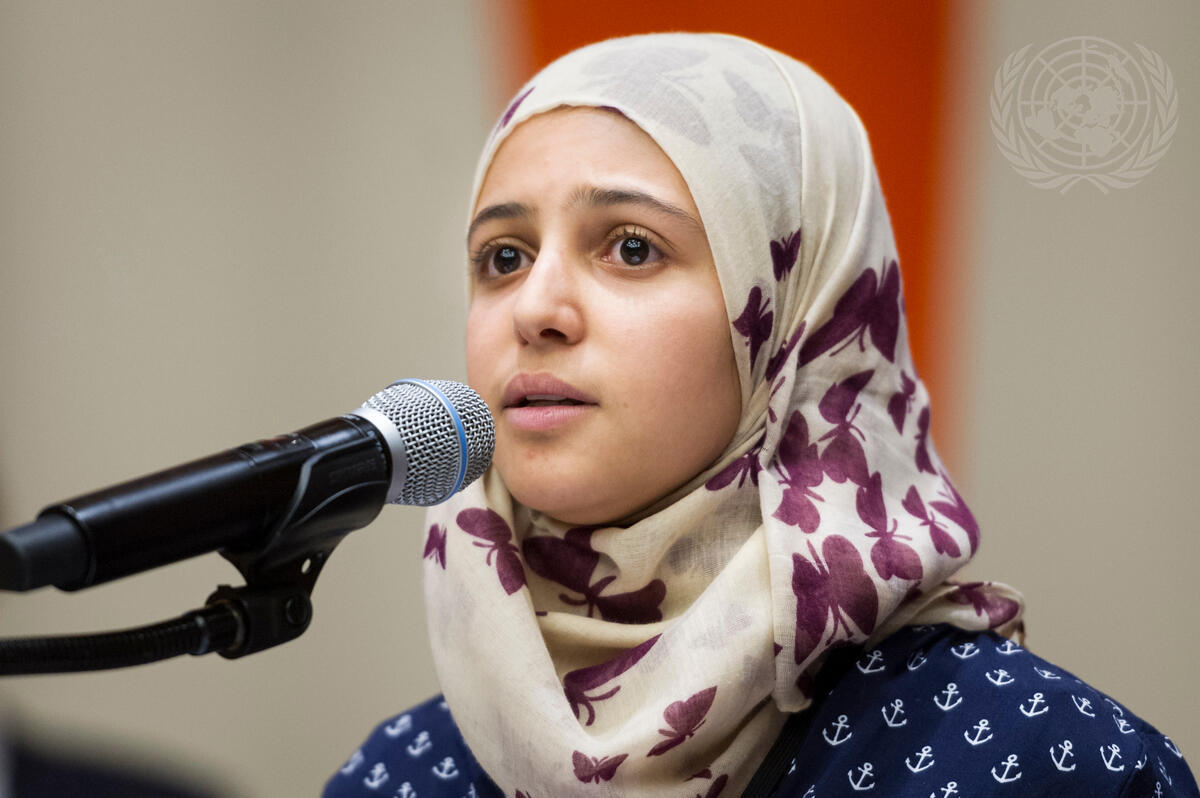 A young Syrian refugee addresses an event on ""Financing the Future: Education 2030"".