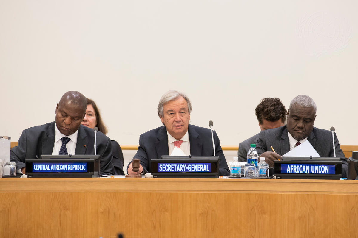 Secretary-General António Guterres (centre) addresses a High-level Ministerial Meeting on the Central African Republic, on the margins of the General Assembly’s annual general debate. He is flanked by Faustin Archange Touadéra (left), President of the Central African Republic; and Moussa Faki Mahamat, Chairperson of the African Union Commission.