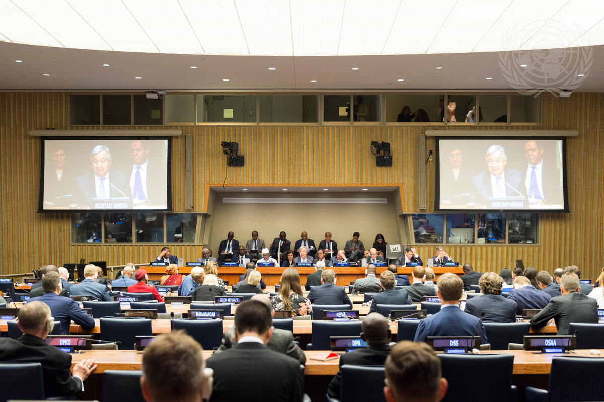 Secretary-General António Guterres (shown on screens) addresses the Ministerial Meeting on the Implementation of the Agreement for Peace and Reconciliation in Mali. The meeting took place on the margins of the General Assembly’s annual general debate.