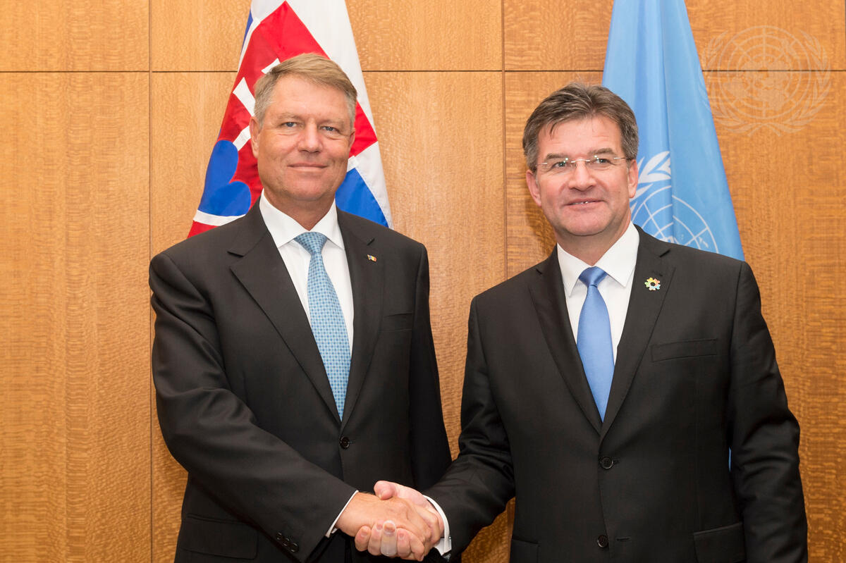 Miroslav Lajcák (right), President of the seventy-second session of the General Assembly, meets with Klaus Iohannis, President of Romania