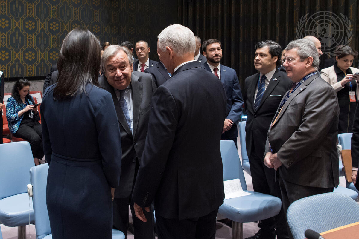 Secretary-General António Guterres (second from left), speaks with Nikki Haley (left, back to camera), Permanent Representative of the United States, and Mike Pence (centre, back to camera), Vice President of the United States.