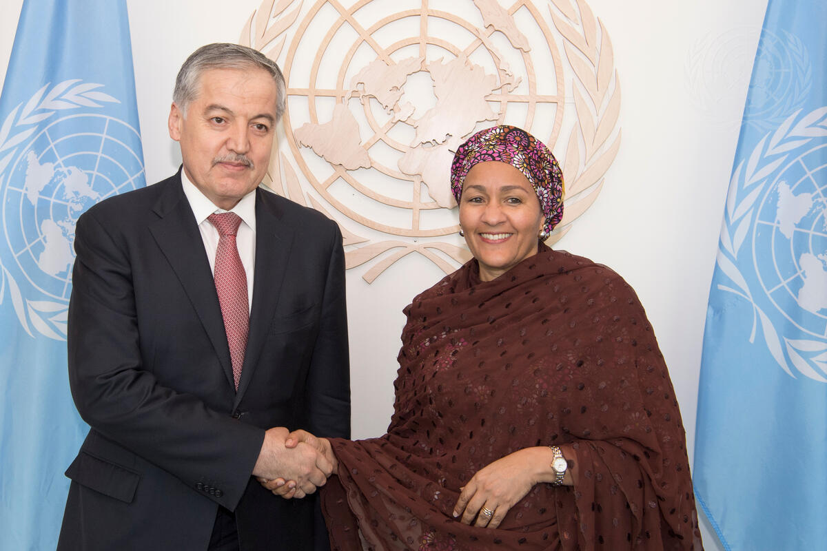 Deputy Secretary-General Amina Mohammed (right) meets with Sirodjidin Aslov, Minister for Foreign Affairs of the Republic of Tajikistan.