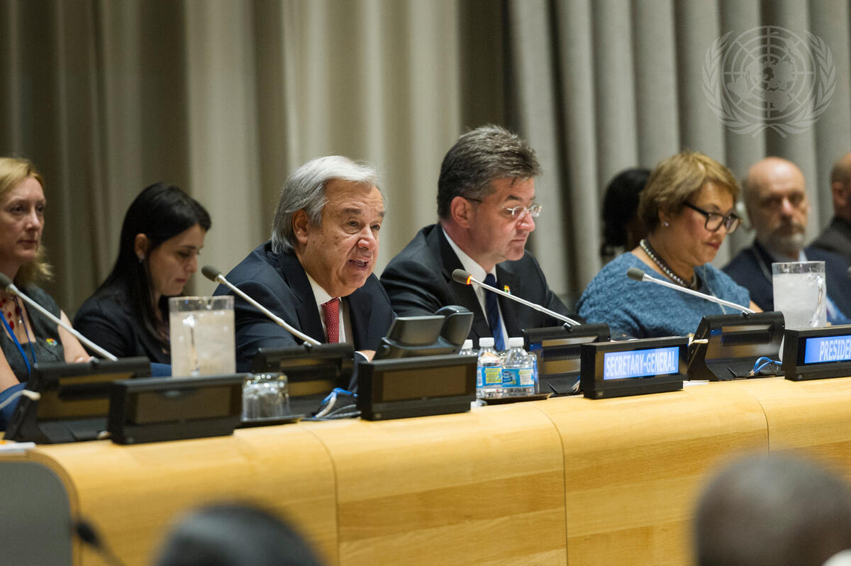 Secretary-General António Guterres (left) addresses the high-level plenary meeting on the International Day for the Total Elimination of Nuclear Weapons. Sharing the podium with the Secretary-General are Miroslav Lajcák (centre), President of the seventy-second session of the General Assembly, and Catherine Pollard (right), Under-Secretary-General for General Assembly and Conference Management.