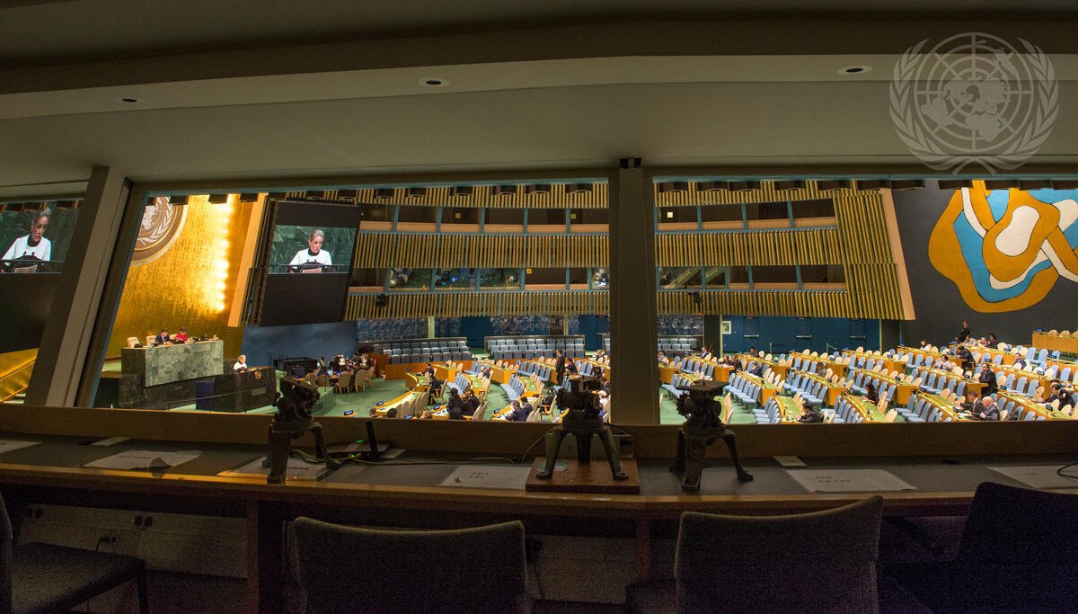 A view of the General Assembly Hall from a press booth as María Emma Mejía Vélez (shown on screens), Permanent Representative of Colombia to the UN, addresses the Assembly's meeting on the Secretary-General’s annual report on the work of the Organization.