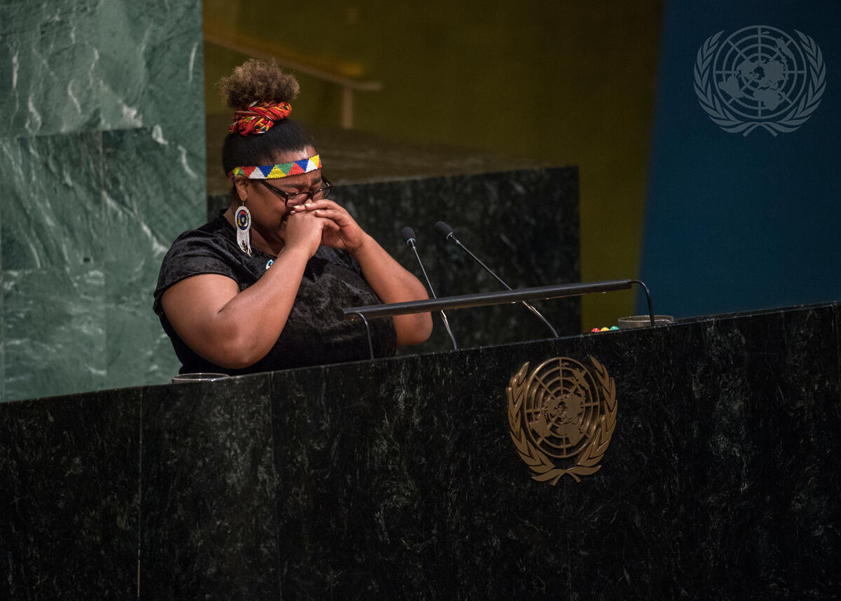 Grizelda Grootboom, civil society representative from South Africa and survivor of human trafficking, addresses the high-level meeting of the General Assembly to appraise progress achieved in the implementation of the United Nations Global Plan of Action to Combat Trafficking in Persons.