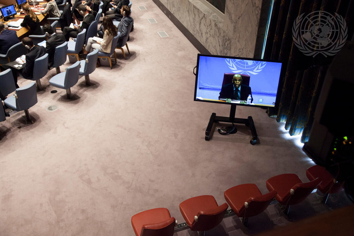 Festus Mogae (shown on screen), Chairperson of the Joint Monitoring and Evaluation Commission (JMEC) for the South Sudan peace accords, briefs the Security Council via video conference.