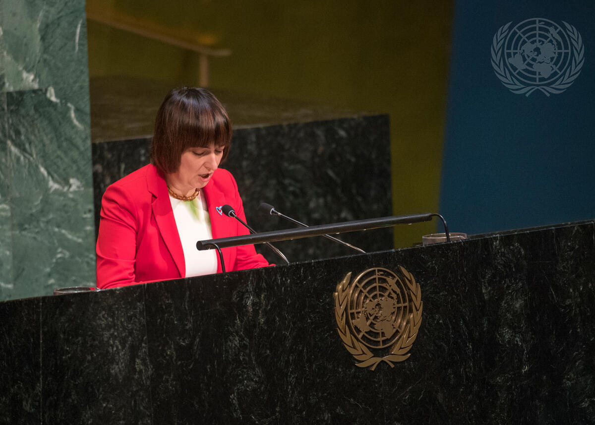Natalia Fedorovych, Vice Minister for Social Policy of Ukraine, addresses the high-level meeting of the General Assembly on the appraisal of the UN Global Plan of Action to combat human trafficking.
