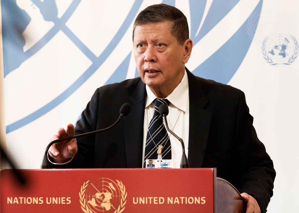 Marzuki Darusman, Chairperson of the Independent International Fact-Finding Mission on Myanmar, addresses the press after presenting an update on the work of the Mission.