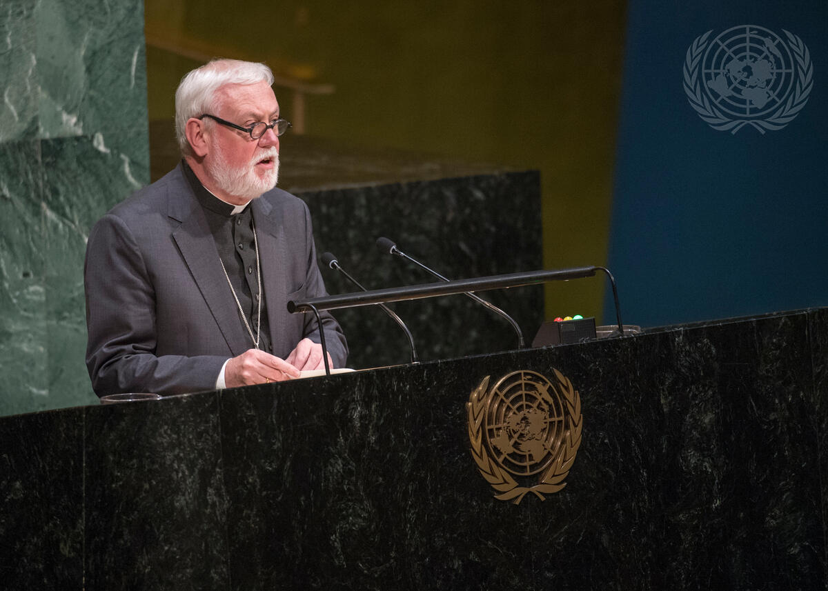 Archbishop Paul Richard Gallagher, Secretary for the Relations with States of the Holy See, addresses the General Assembly high-level meeting to appraise progress achieved in the implementation of the United Nations Global Plan of Action to Combat Trafficking in Persons.