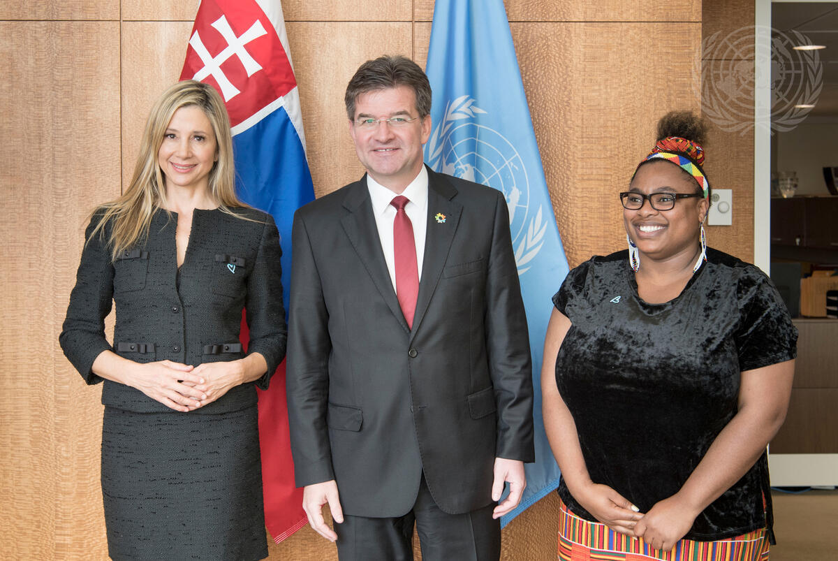 Miroslav Lajcák (centre), President of the seventy-second session of the General Assembly, meets with Mira Sorvino (left), UNODC (UN Office on Drugs and Crime) Goodwill Ambassador for Global Fight against Human Trafficking; and Grizelda Grootboom, survivor of human trafficking from South Africa.