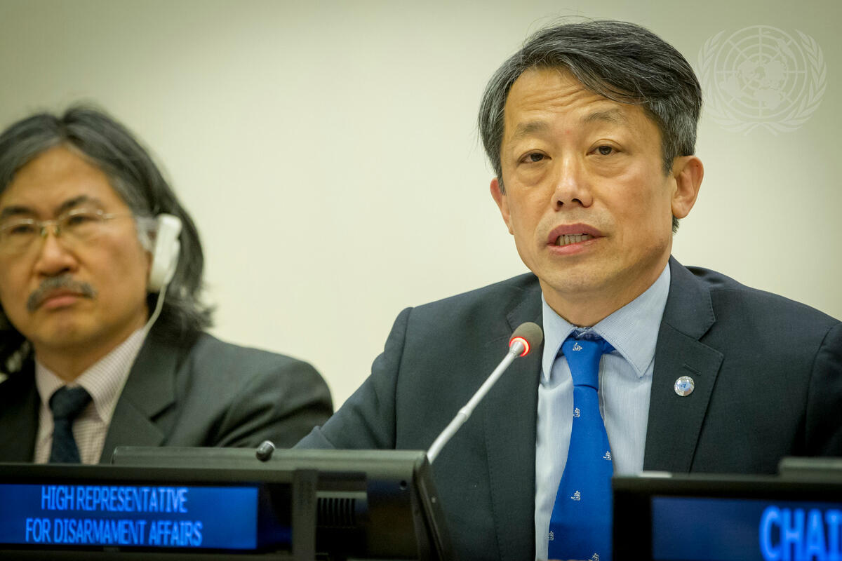 Kim Won-soo (right), Acting UN High Representative for Disarmament Affairs, addresses the opening meeting of the 2016 substantive session of the Disarmament Commission, taking place in New York 4-22 April.